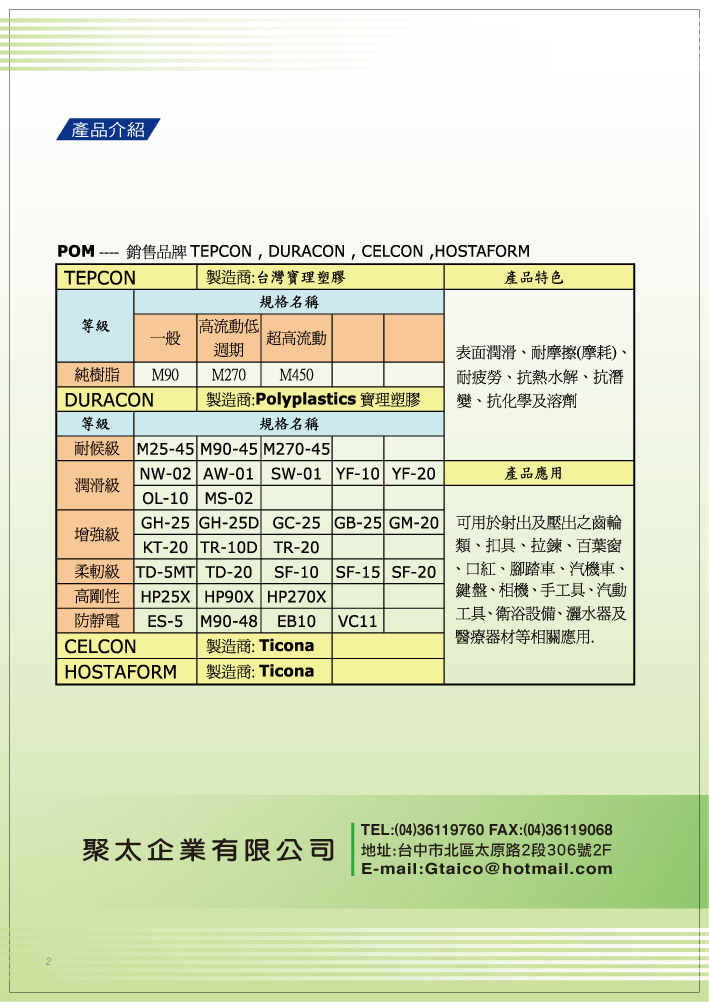 聚太企業自1979年成立後,經營塑膠原料貿易,請見代理銷售產品簡介,如需詳細物性表或其他資料,請聯絡敝司